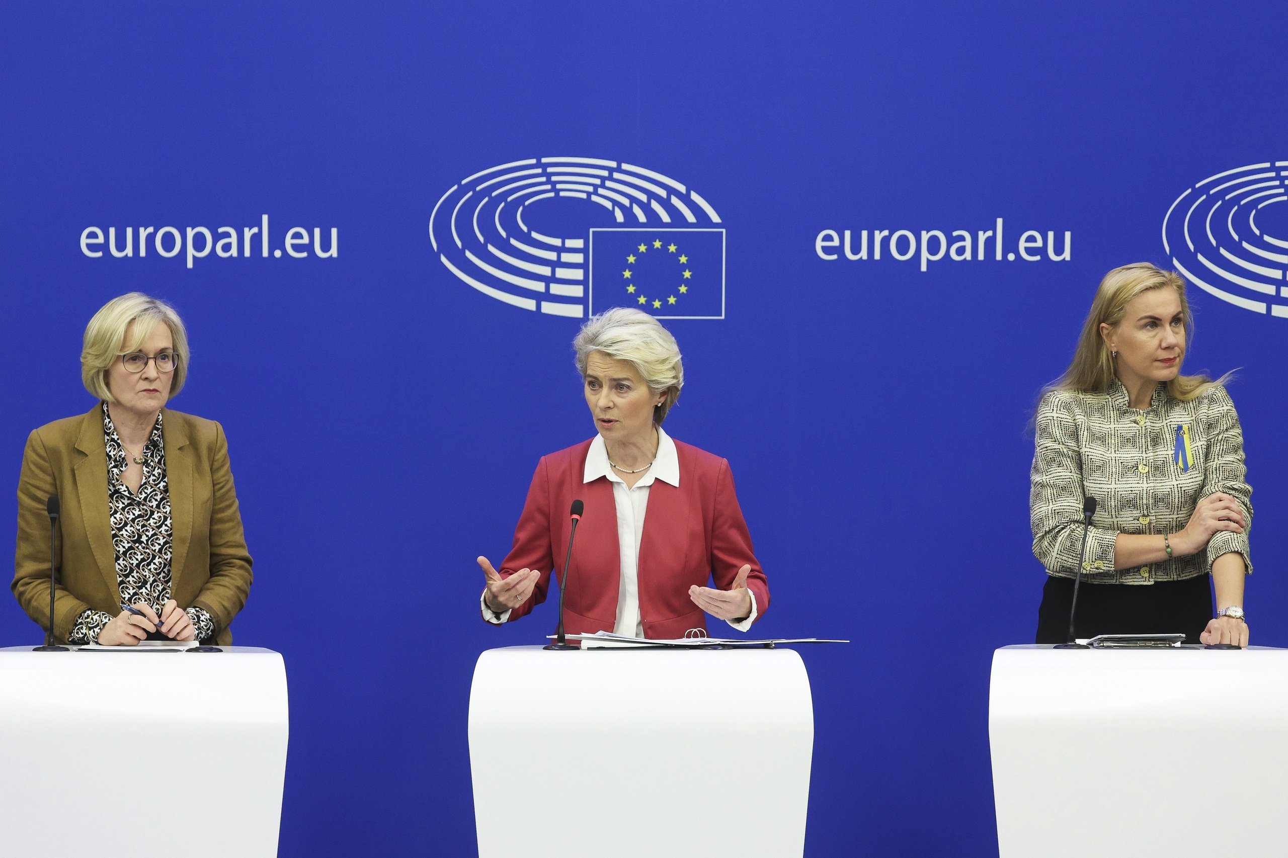 Mairead McGuinness, Eurocommissaris voor Financiële Diensten, Financiële Stabiliteit en de Kapitaalmarkten, voorzitter Ursula von der Leyen van de Europese Commissie, en Kadri Simson, Eurocommissaris voor Energie (vlnr) tijdens hun persconferentie over de energiemarkten dinsdag in Straatsburg. (Foto: ANP/EPA)