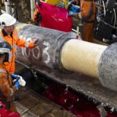 Boven het wateroppervlak van de Noordzee zoeven twaalf meter lange buizen door de lucht. Met een hijskraan hevelt de bemanning van pijplegschip Lorelay de stalen gevaartes over, van het bevoorradingsschip op het eigen dek.