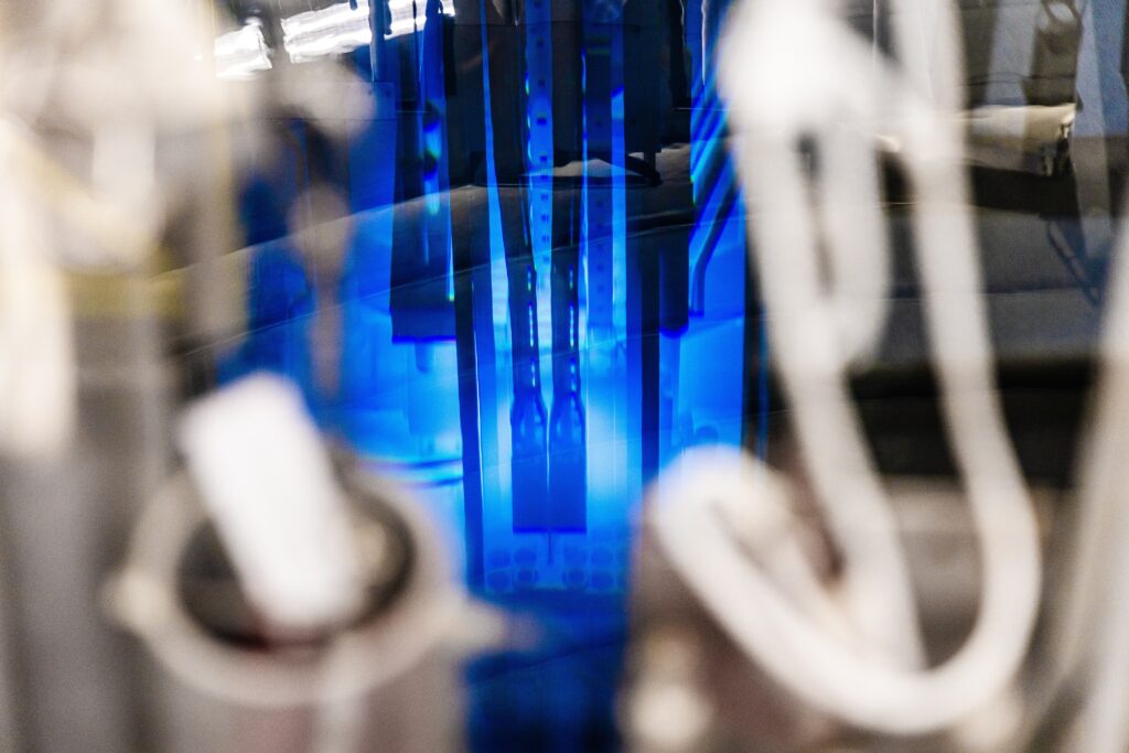 Het zogeheten cherenkoveffect zorgt voor blauw licht in de onderzoeksreactor van de TU Delft. (Foto: Jeffrey Groeneweg/ANP)