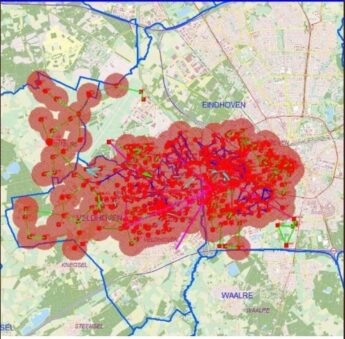 Netbeheerder Enexis plaatste zondag een afbeelding van het getroffen gebied op twitter, dat volgens de netbeheerder 90% accuraat is. Dit is de situatie nadat trafo Eindhoven-Zuid weer in bedrijf is genomen. (Bron: Enexis)