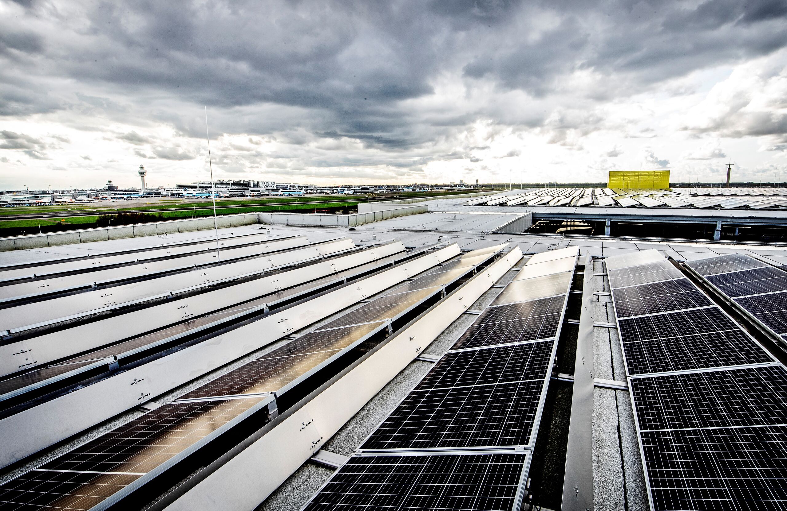 Op het dak van parkeergarage P3 van Schiphol zijn afgelopen jaar zesduizend zonnepanelen gelegd om de luchthaven deels van energie te voorzien. In de toekomst wil de luchthaven ook zonnepanelen plaatsen langs start-en landingsbanen. (Foto: Pim Ras / HH)